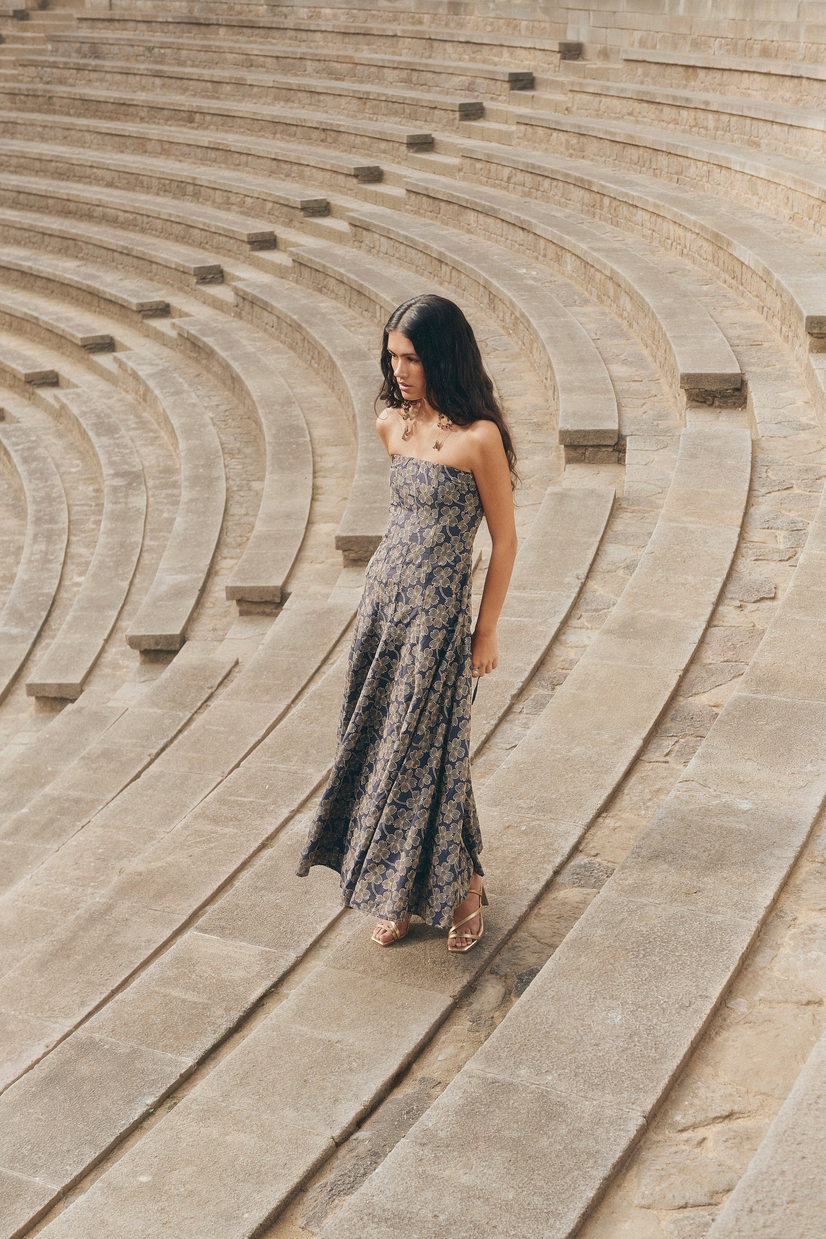 The design features a strapless neckline and numerous vertical seams highlighted with contrast piping that flatter the figure. At the back, a tie allows the garment to be adjusted to the body, making the dress fully adjustable. It includes a concealed side zipper and is fully lined to prevent transparency and ensure greater comfort.
