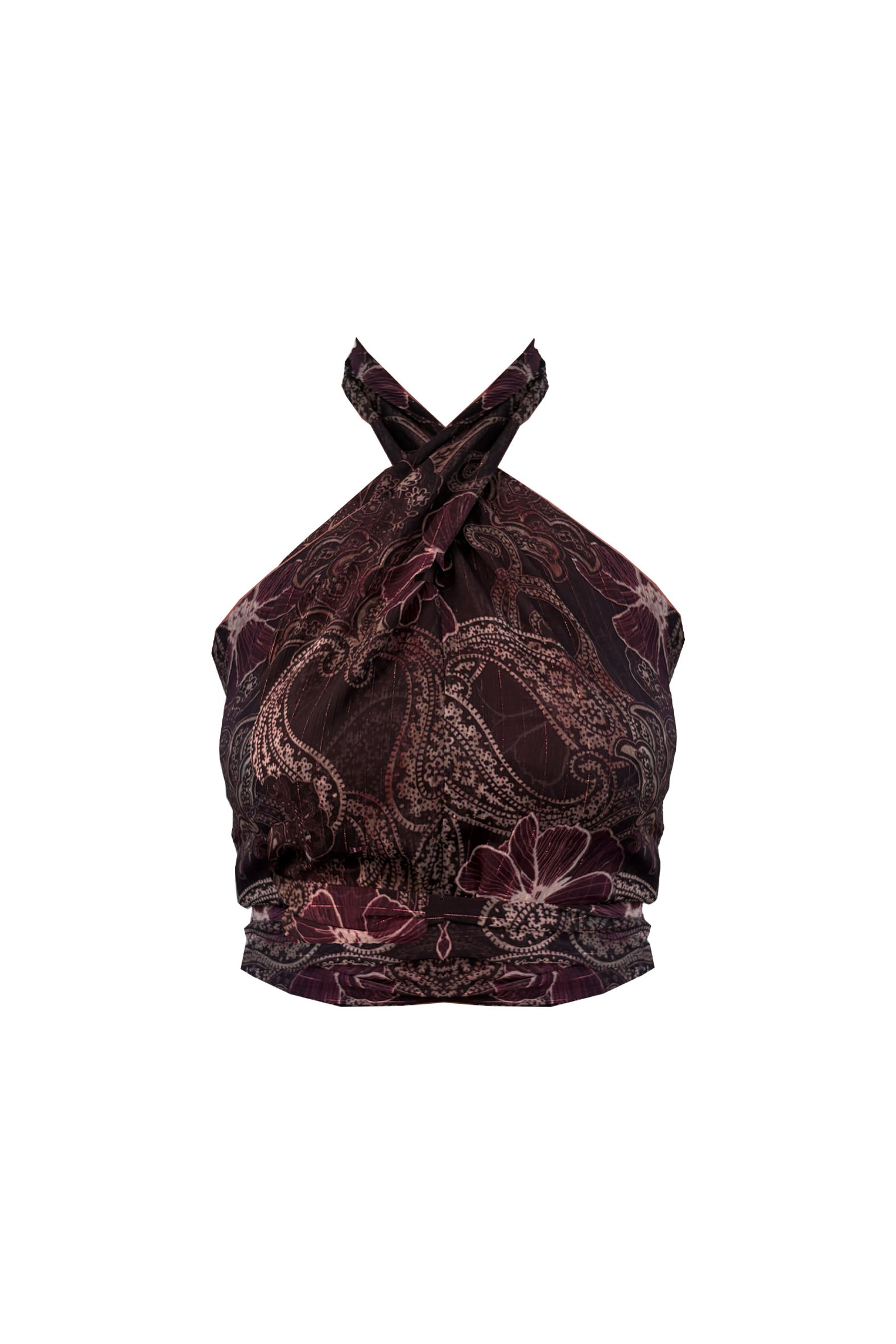 The Sienna Top features a crossover halter neckline with long adjustable straps that tie at the back.
