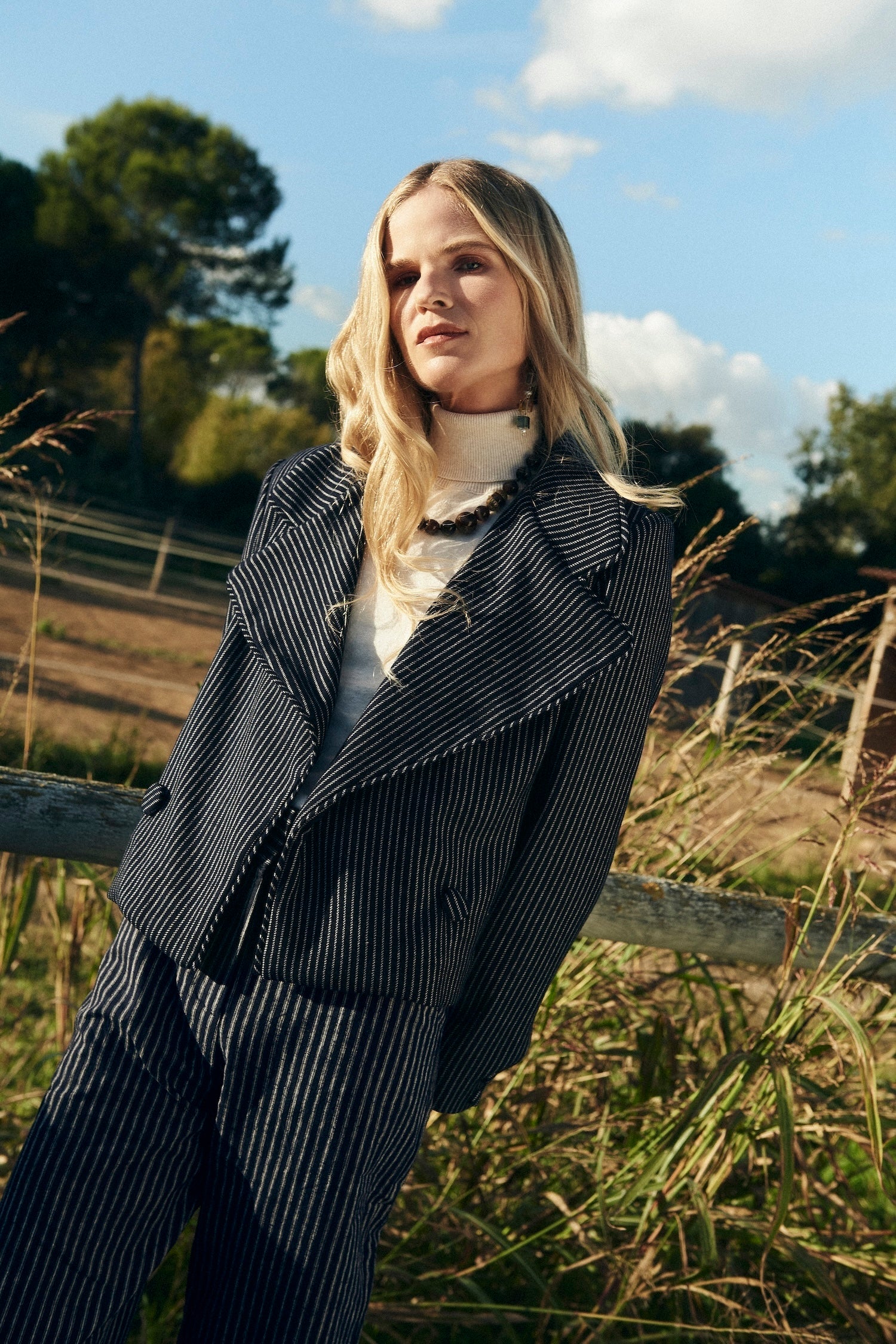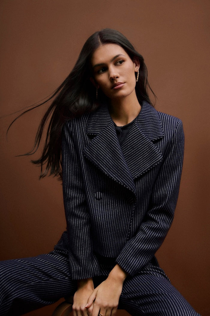 The Alcott blazer stands out for its design, crafted from a vertically striped fabric in navy and ecru tones. Its silhouette is defined by a wide lapel finished with piping that runs along the entire front closure, ending in a double-breasted fastening with two covered buttons.