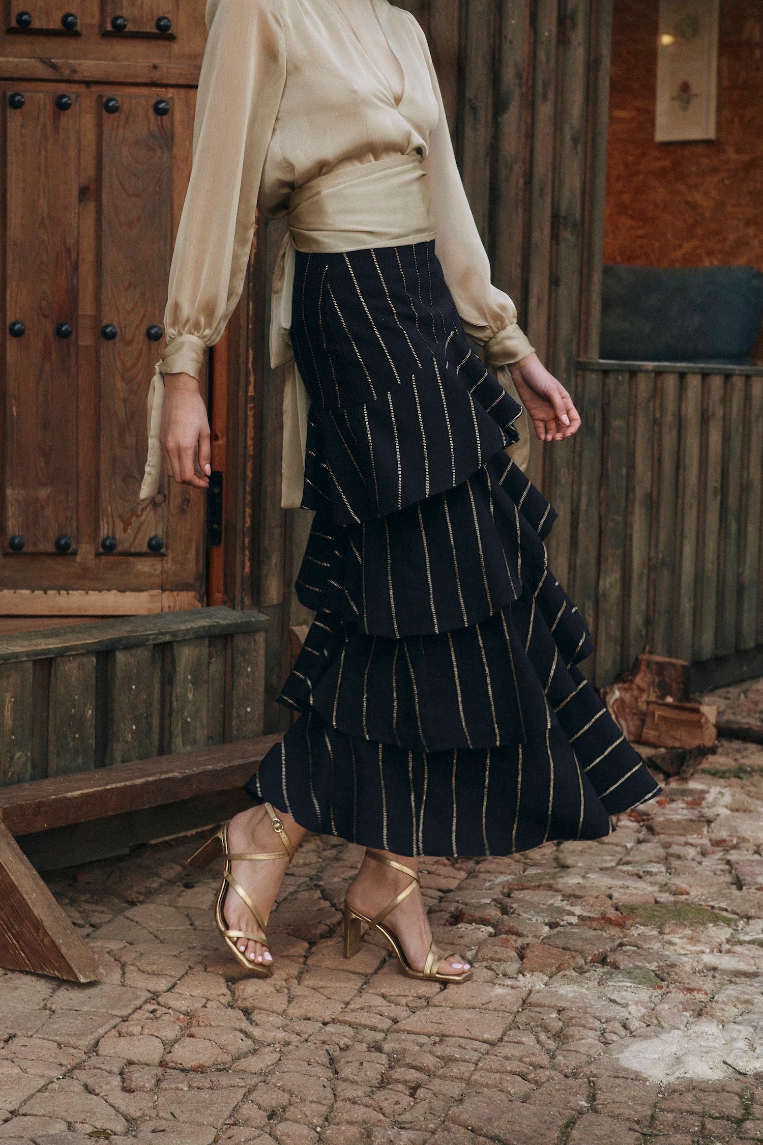 The Jude skirt is distinguished by its cotton fabric with golden lurex stripes on a navy background. The skirt features a waistband at the waist and hips that defines the silhouette and gives way to several layers of ruffles, arranged diagonally and symmetrically at both the front and back. It includes an invisible zipper at the back. Additionally, the waistband is made with two layers of fabric, preventing any transparency and ensuring a more comfortable and flattering fit.