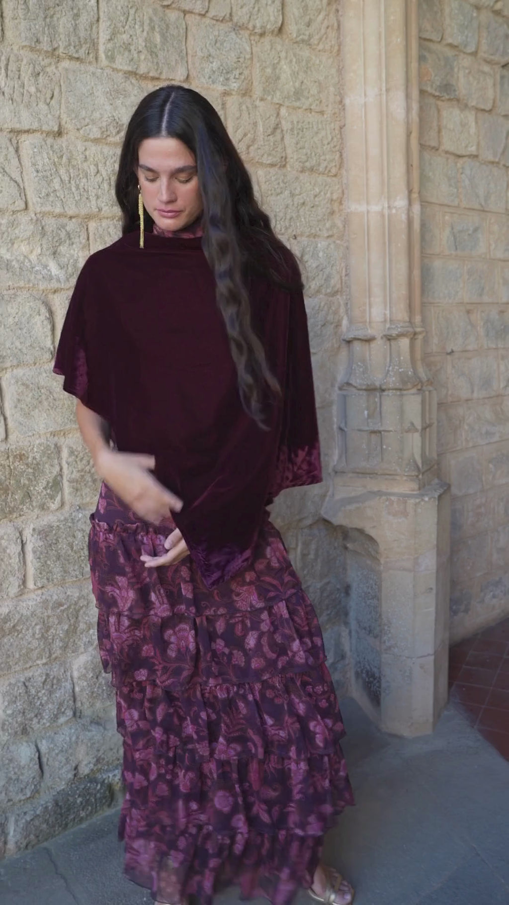 The velvet cape in a wine tone is the ideal accessory to complete your look with a touch of sophistication. Its soft and warm fabric makes it the perfect option to add warmth without sacrificing elegance. With an asymmetrical cut, this piece easily adapts to any outfit, adding style and movement to your look.