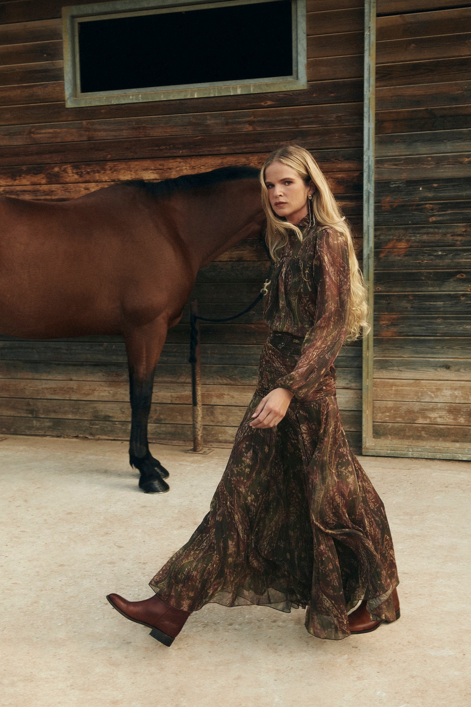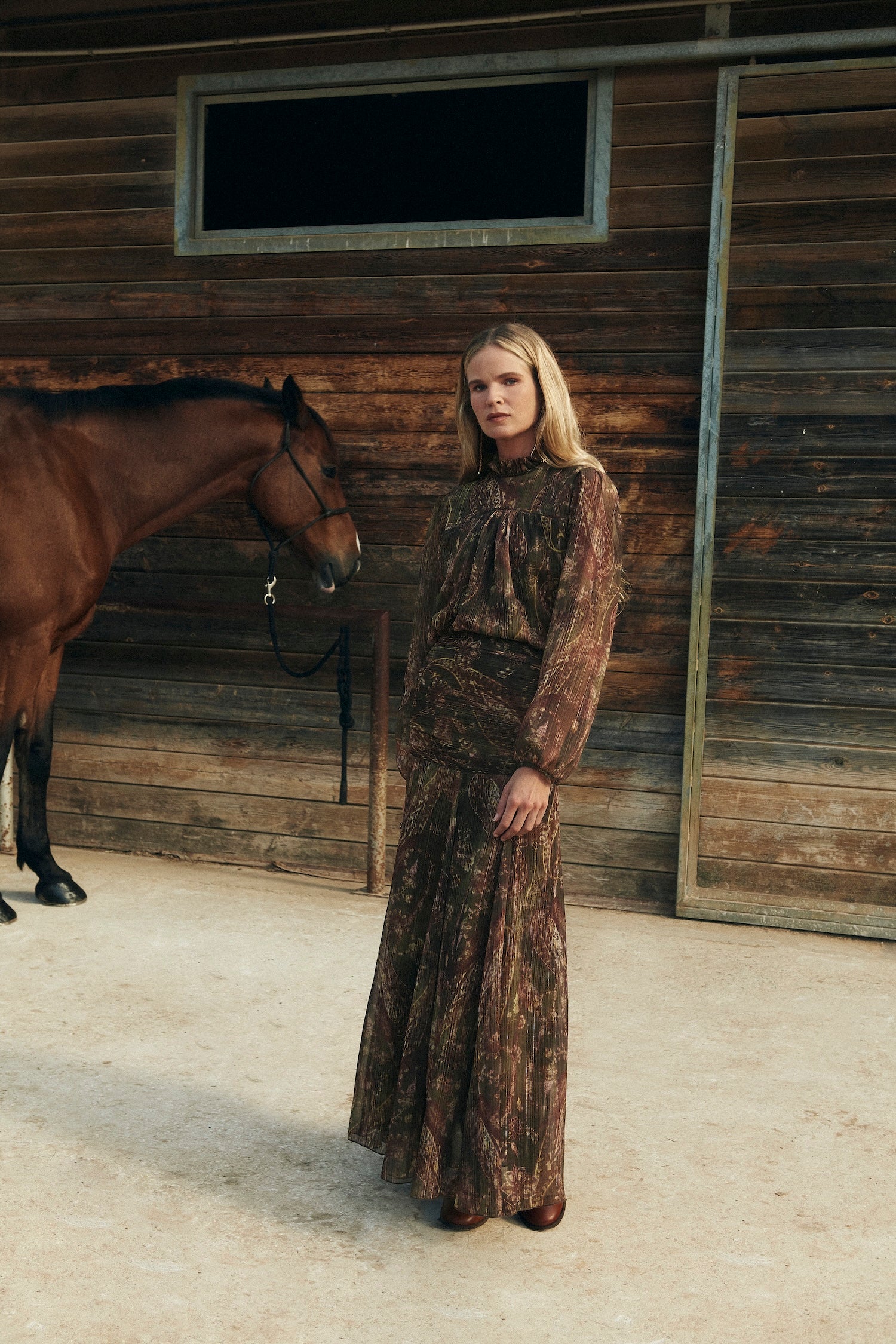 The Carrol Total Look stands out for its original print featuring floral and paisley motifs in green tones with subtle touches of metallic gold thread, all of it printed on a lightweight crinkled chiffon.