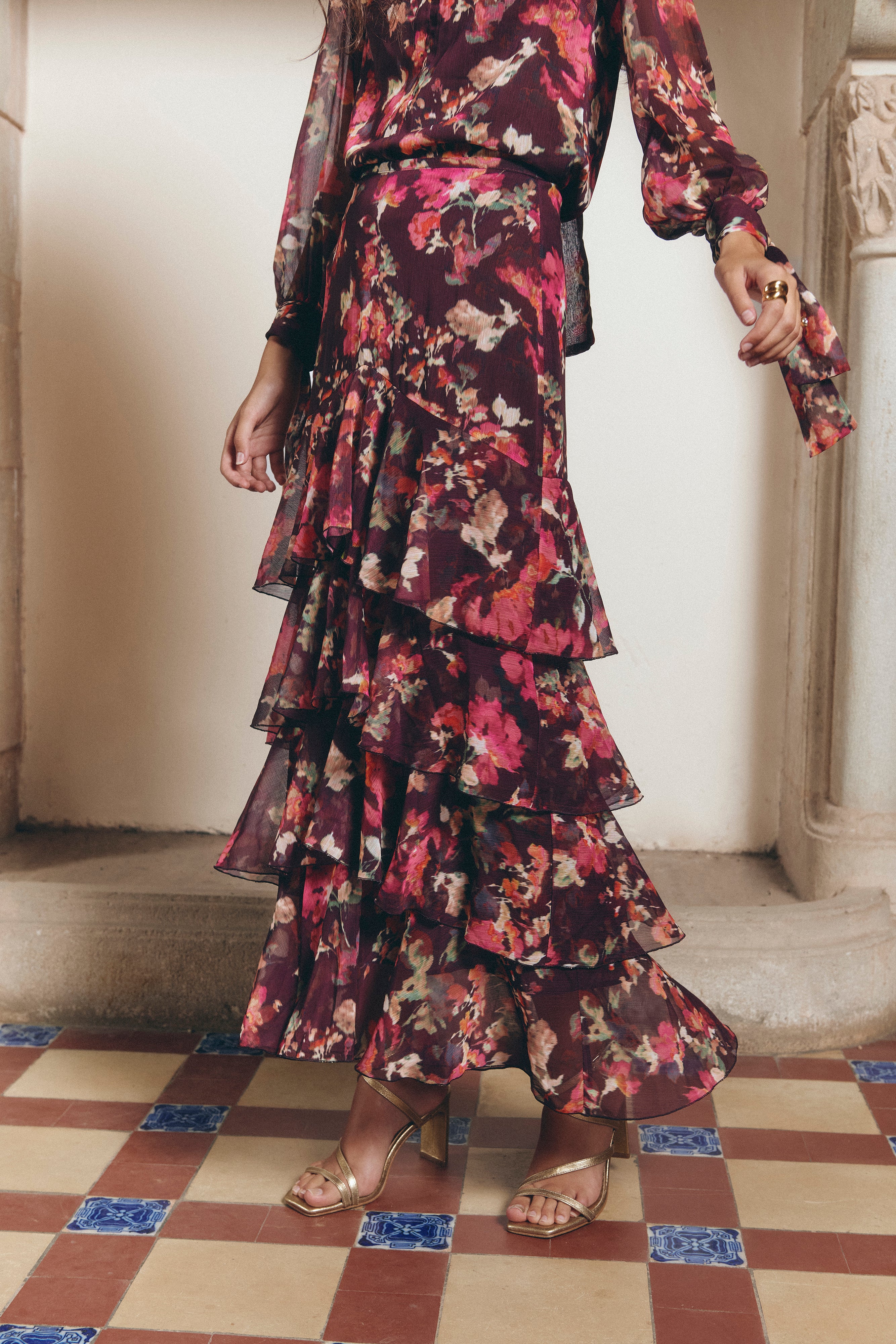 Paola skirt made from the same printed chiffon, midi length, lined, with elastic back waistband.