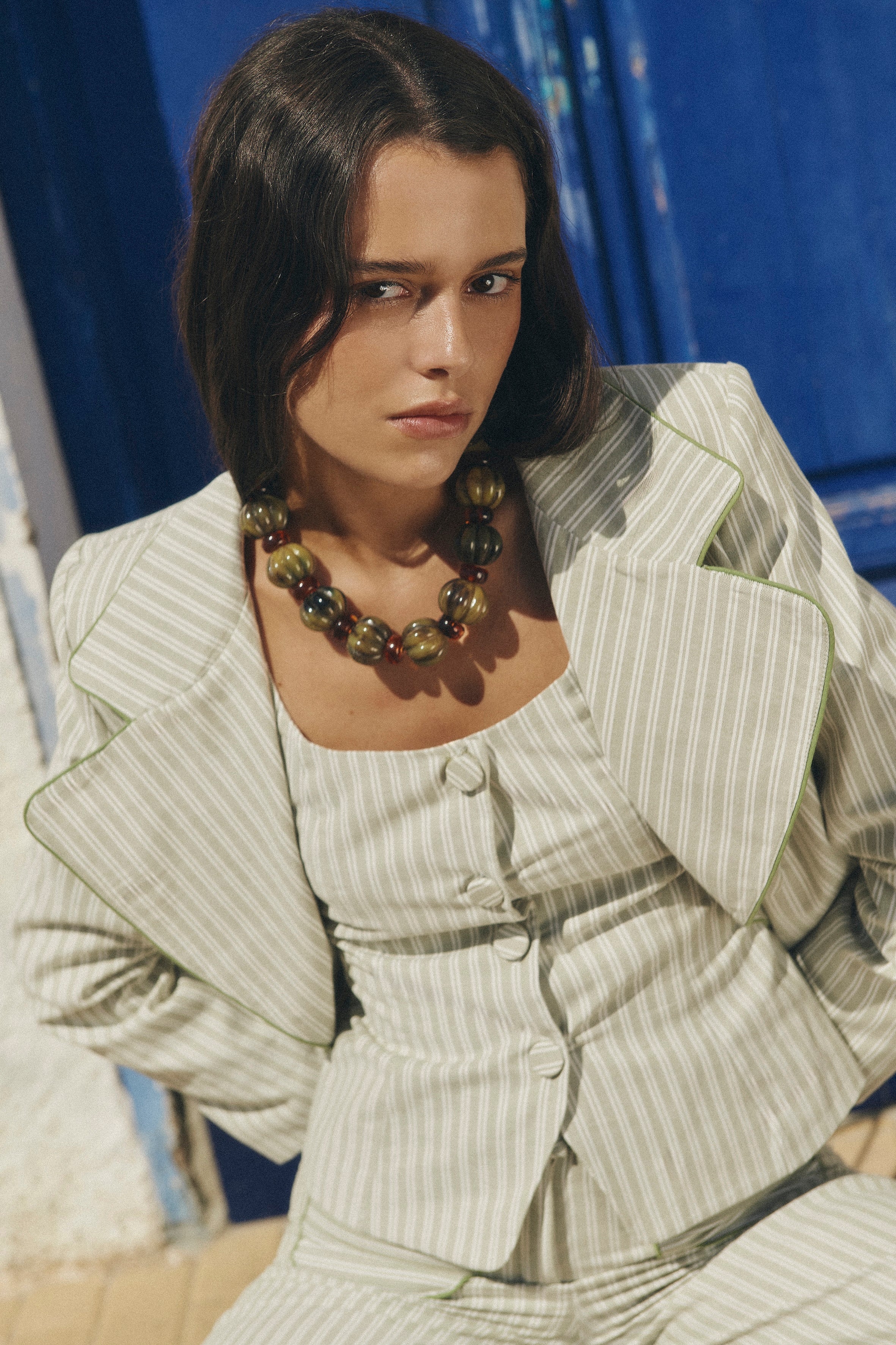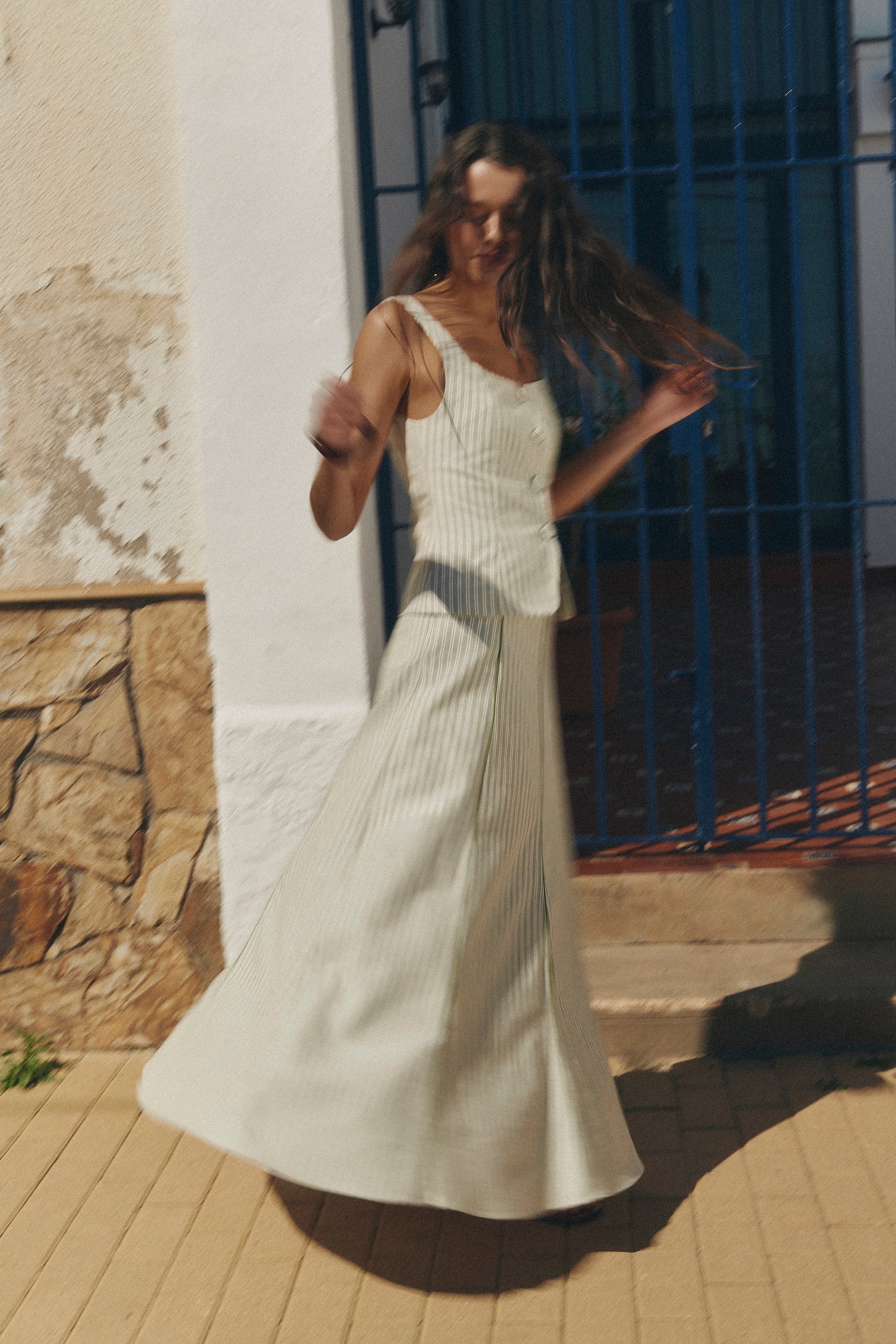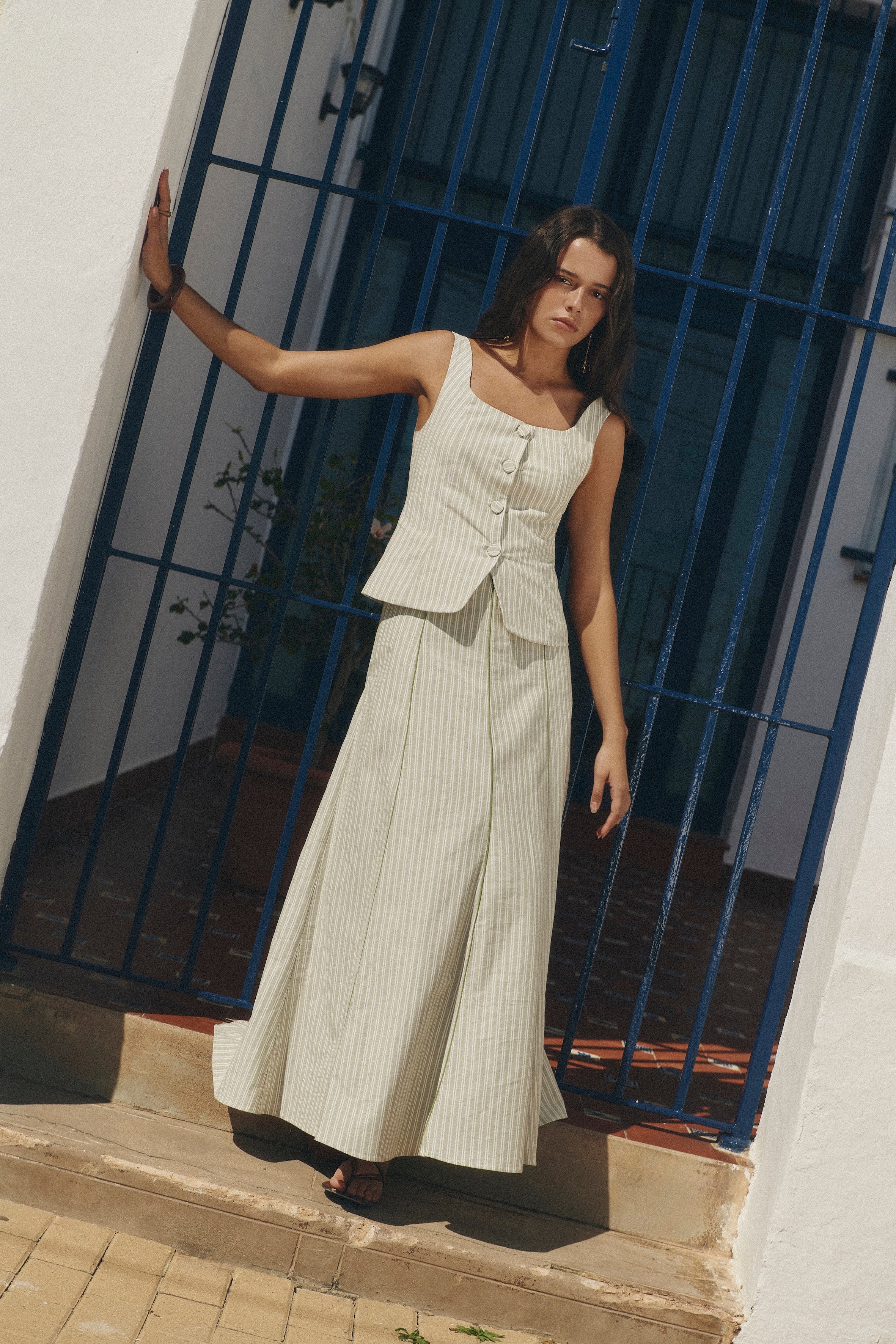 El Chaleco Bianca se distingue por su estampado de finas rayas en tonos crudo y verde suave, una combinación equilibrada que aporta frescura y elegancia al diseño. La disposición vertical del patrón estiliza visualmente la silueta y refuerza el carácter sofisticado de la prenda.