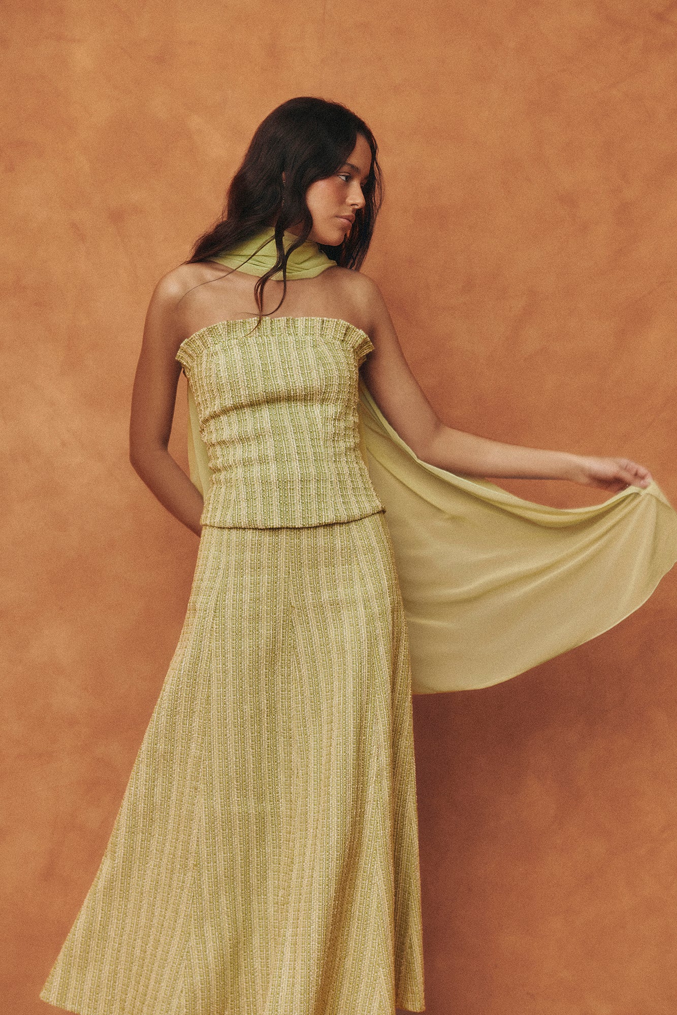 This light green piece pairs with the Penelope total look, the Bloom total look and the Aurelia dress.