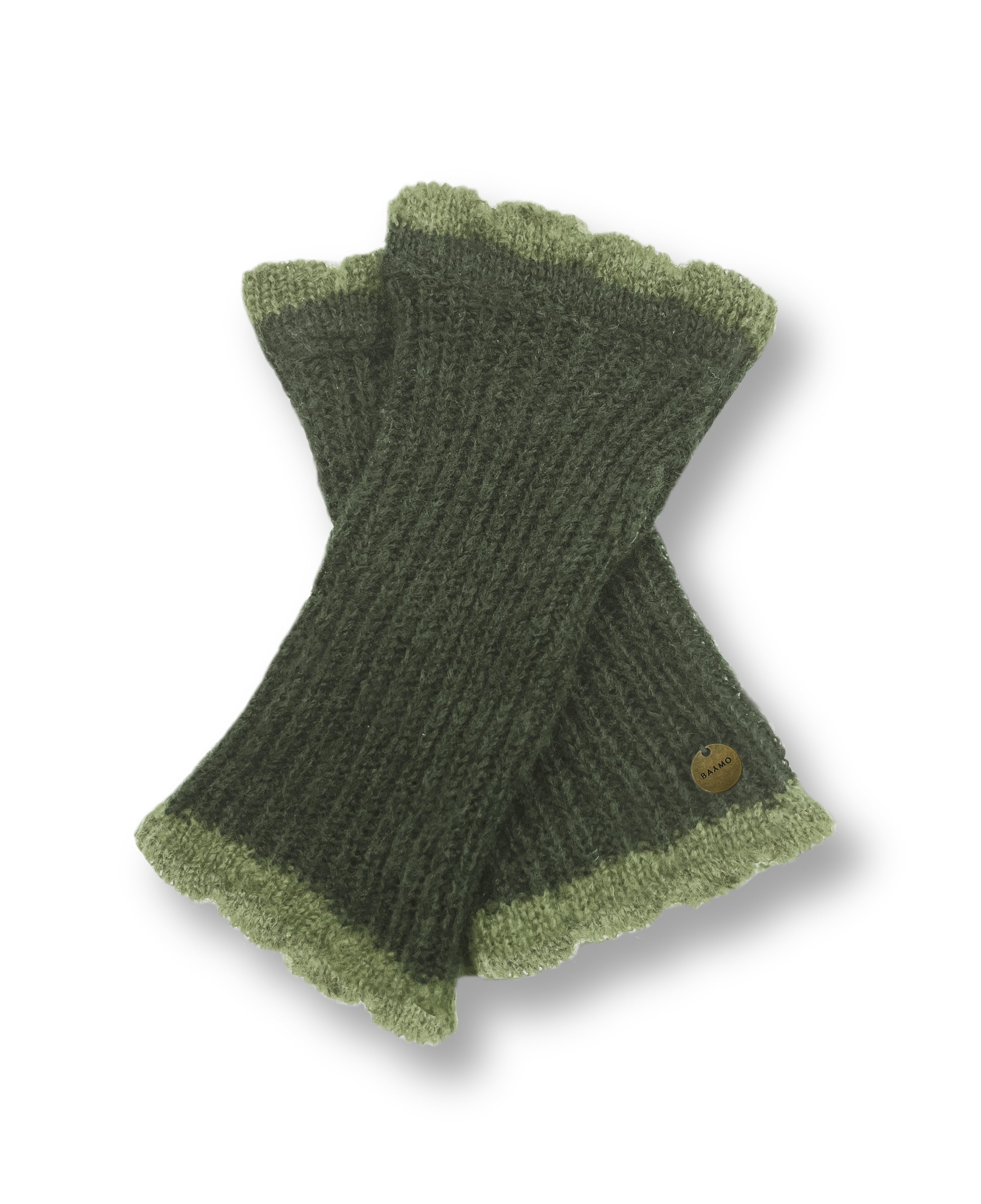 The knitted mittens in different shades of green are the ideal accessory for this winter. Made of soft ribbed knit, they stand out for their delicate wave design on the edges, knitted with a lighter yarn that contrasts with their dark base. Warm, comfortable, and with an artisanal touch, they add style and warmth to any winter look.