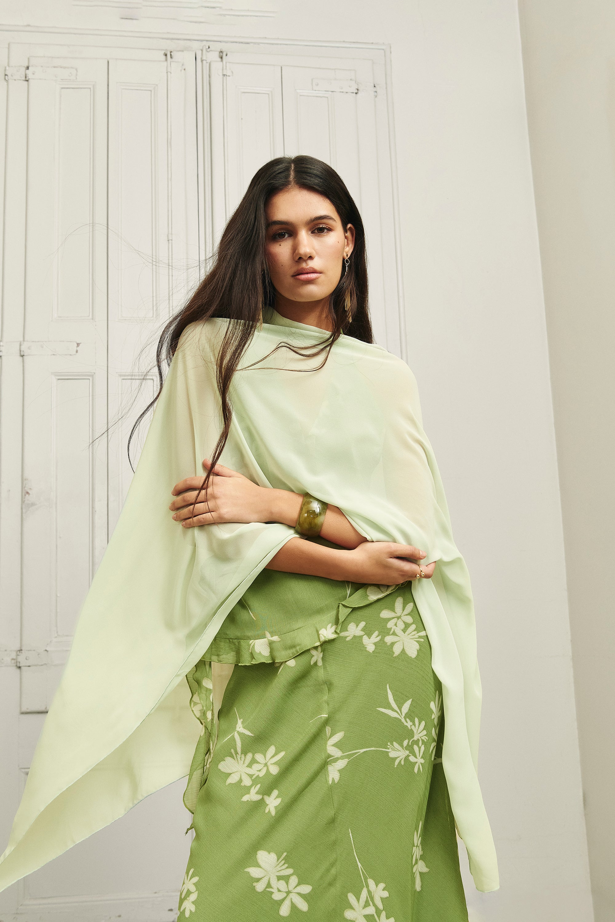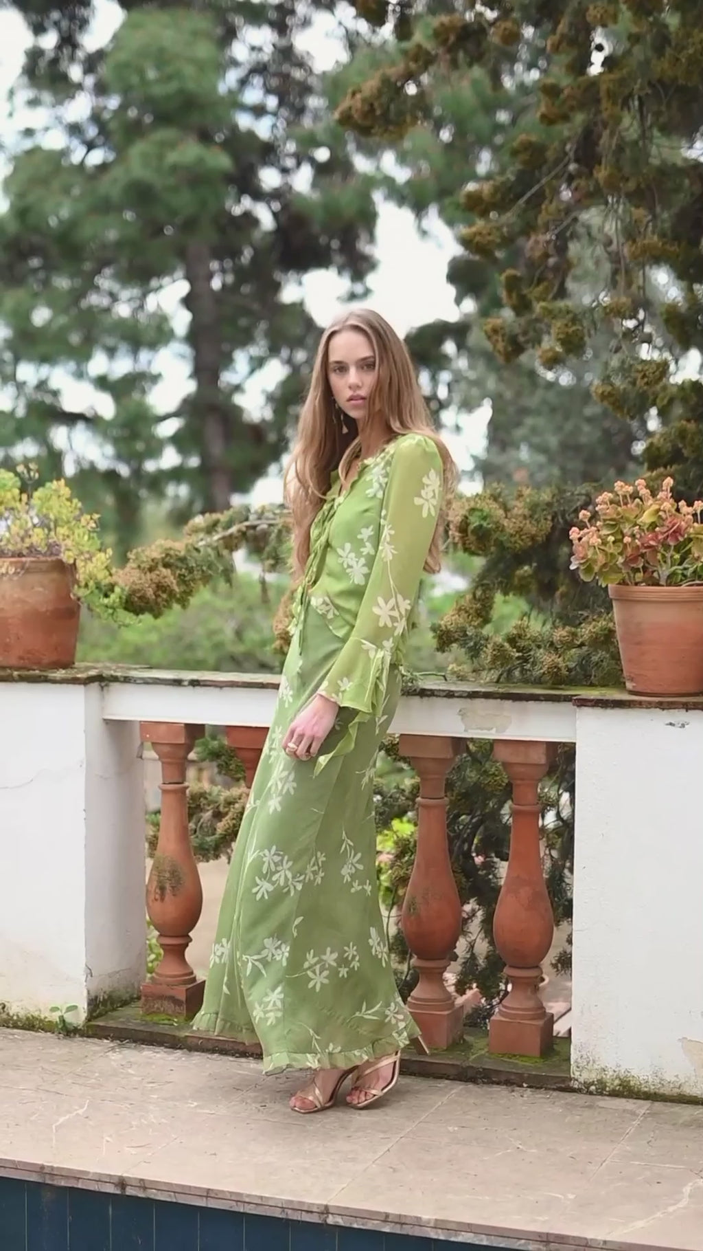 La blusa Marielle, con su delicado estampado floral en tonos verdes sobre gasa bambula, destaca por sus detalles. Esta blusa presenta un escote con volantes y un cierre frontal con lazos hecho del mismo tejido. Los volantes recorren toda la prenda, desde el escote hasta la parte del bajo, creando un efecto fluido y elegante.