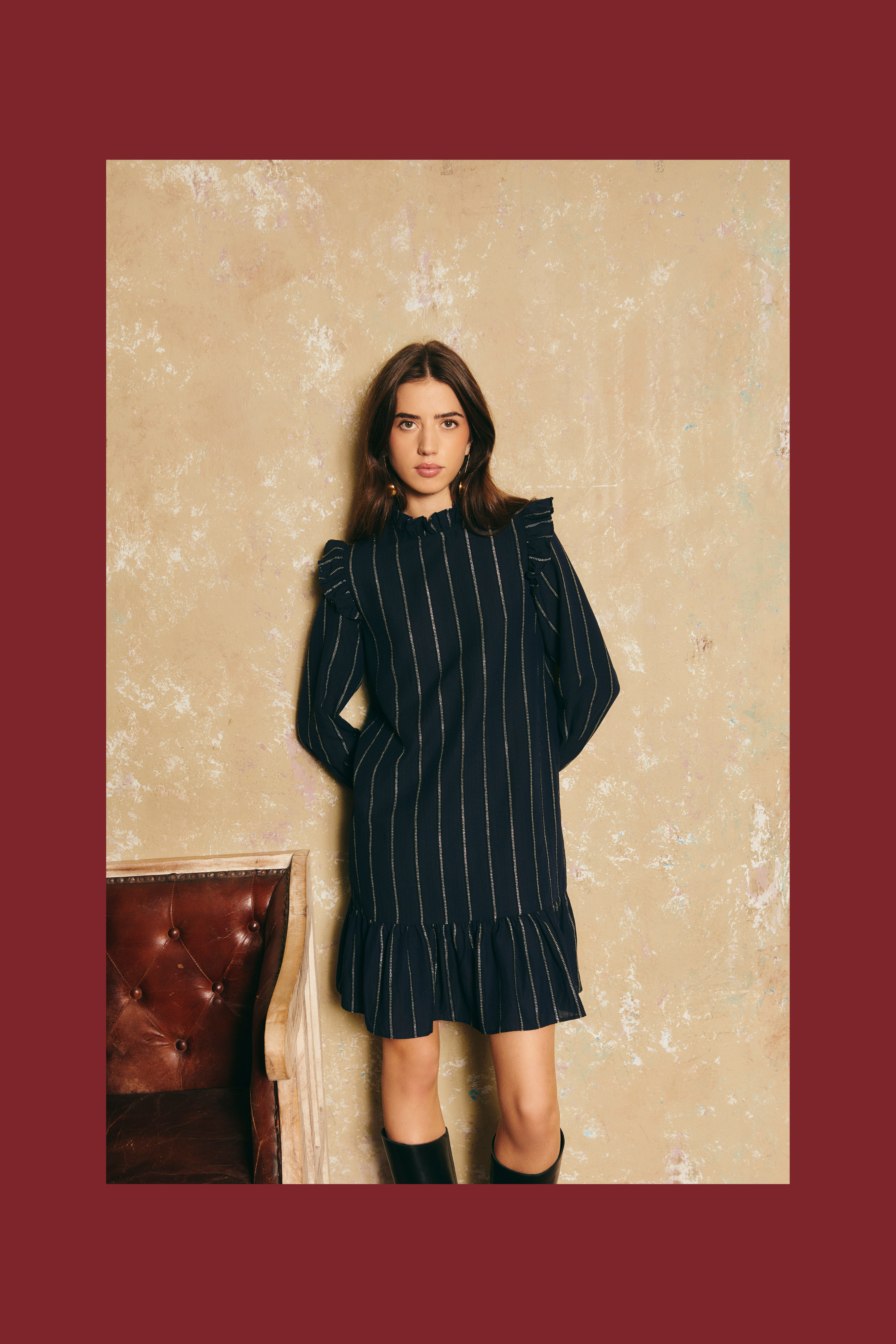 Este elegante vestido azul marino con rayas metalizadas presenta un bonito detalle de volante en los hombros y la sisa. Las mangas abullonadas, con goma elástica en los puños y volantes, le aportan un toque femenino y delicado. El volante en el bajo añade dinamismo, mientras que el cierre con cremallera invisible en el centro de la espalda asegura un ajuste perfecto.