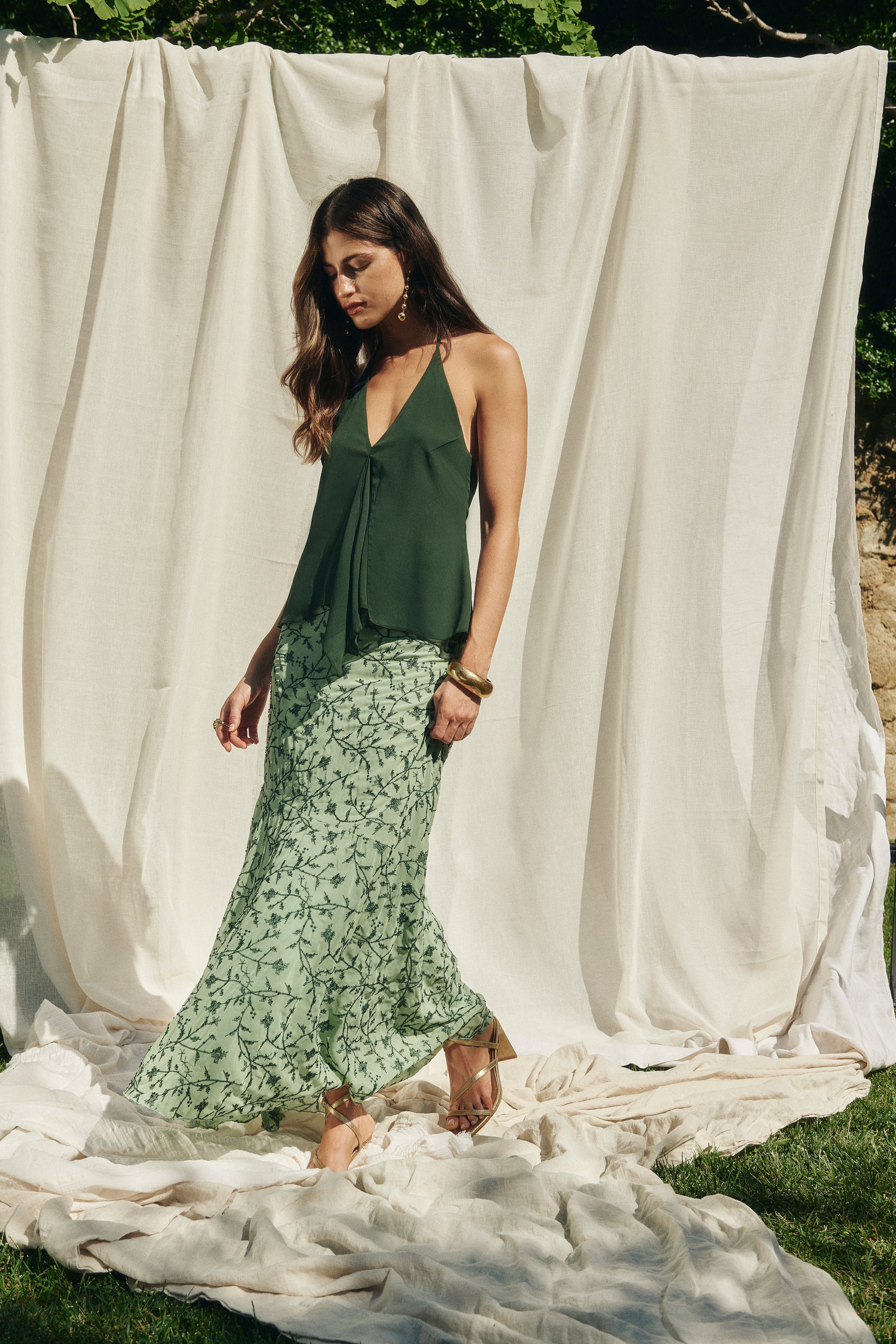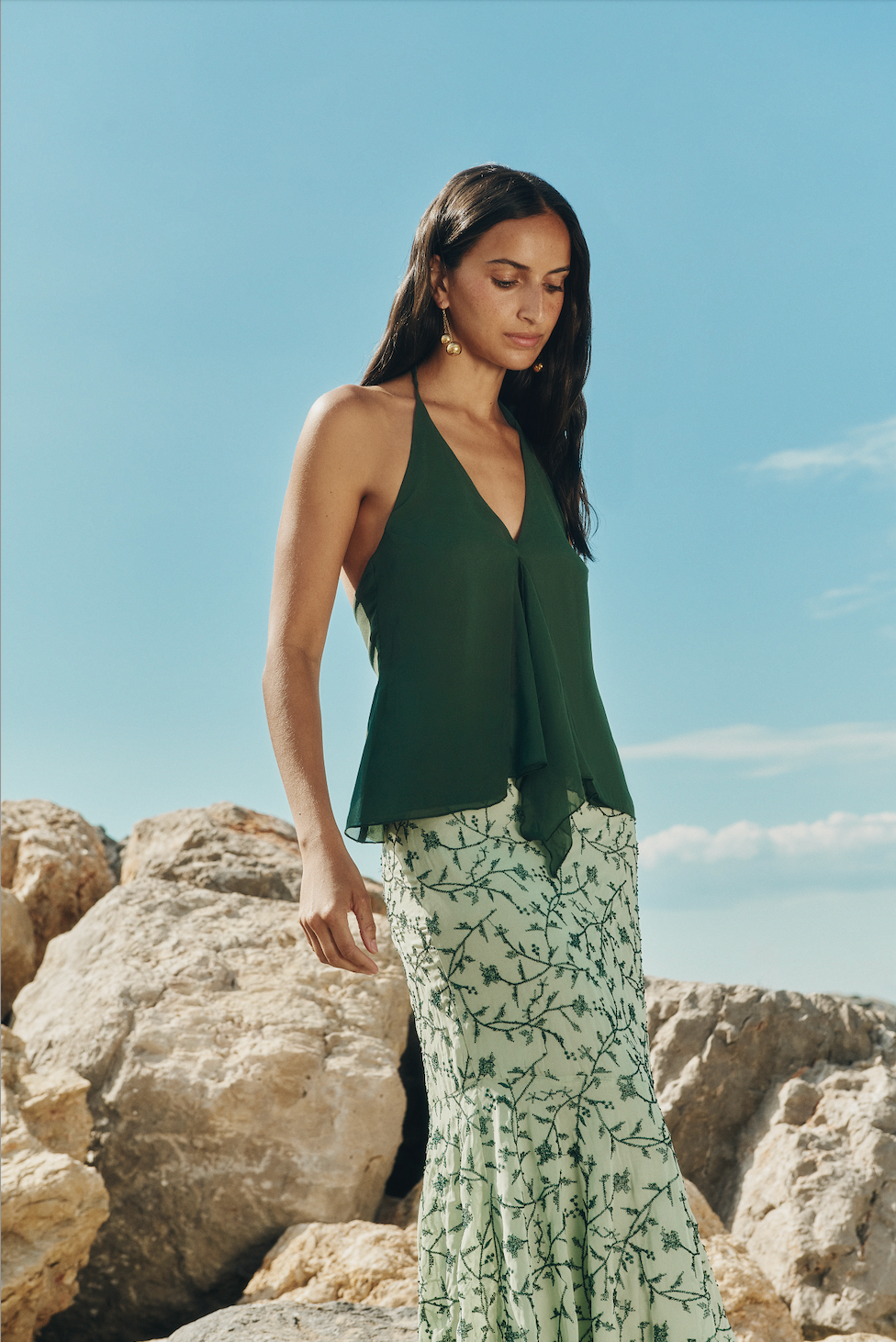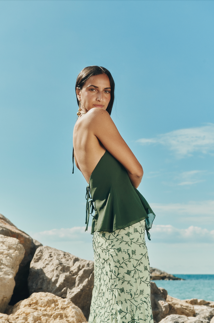 The Lyra top stands out with its design crafted in dark green chiffon. It features a deep neckline with a two-piece front ruffle that opens into an elegant slit. The back includes two ties, along with a neck tie, allowing for a customizable and adjustable fit. The piece is made with two layers of fabric to ensure no transparency.
